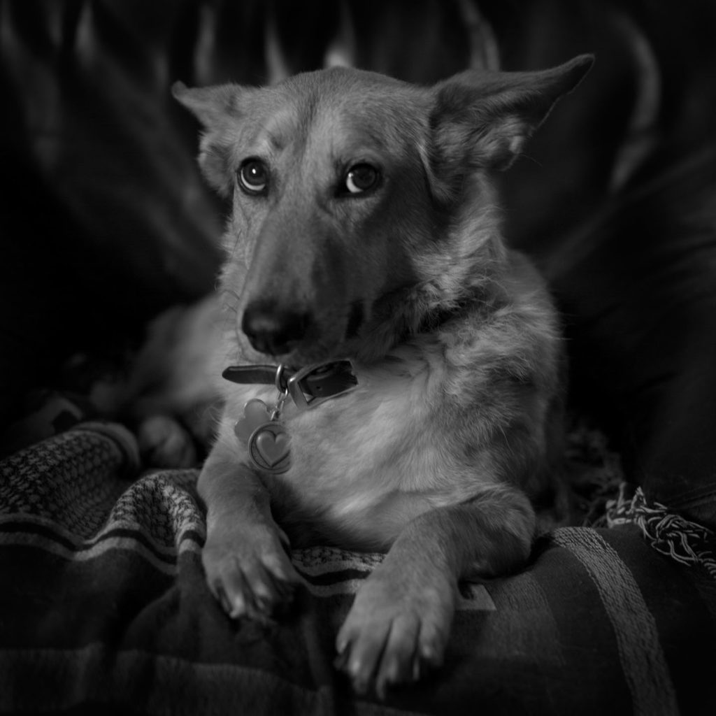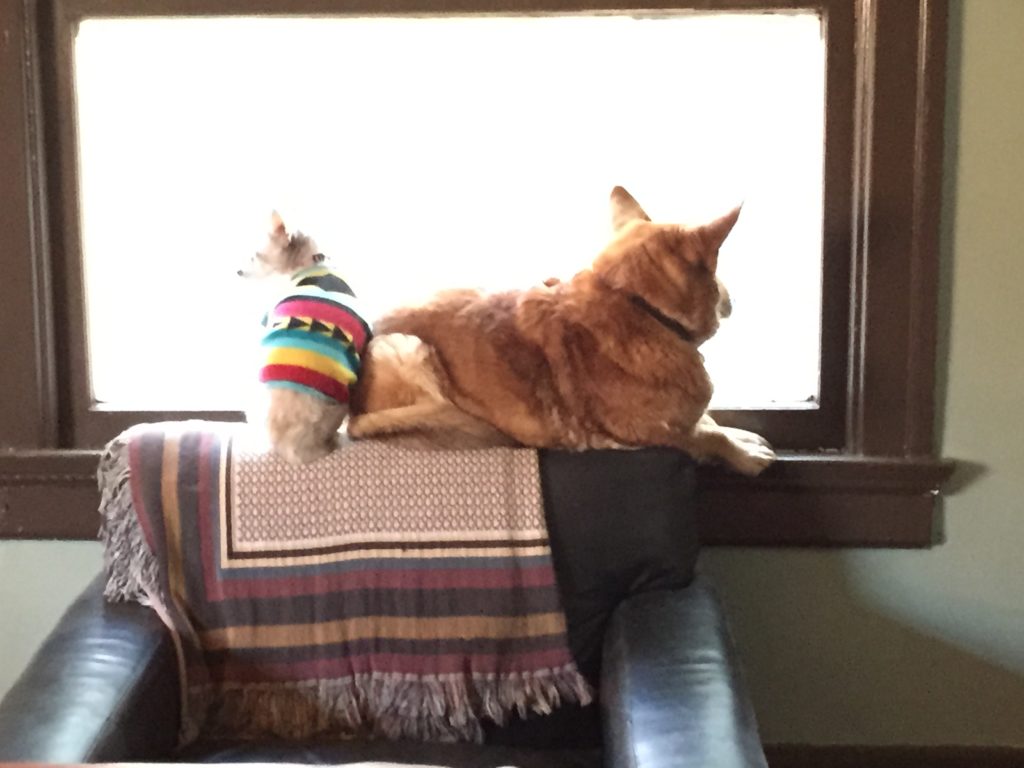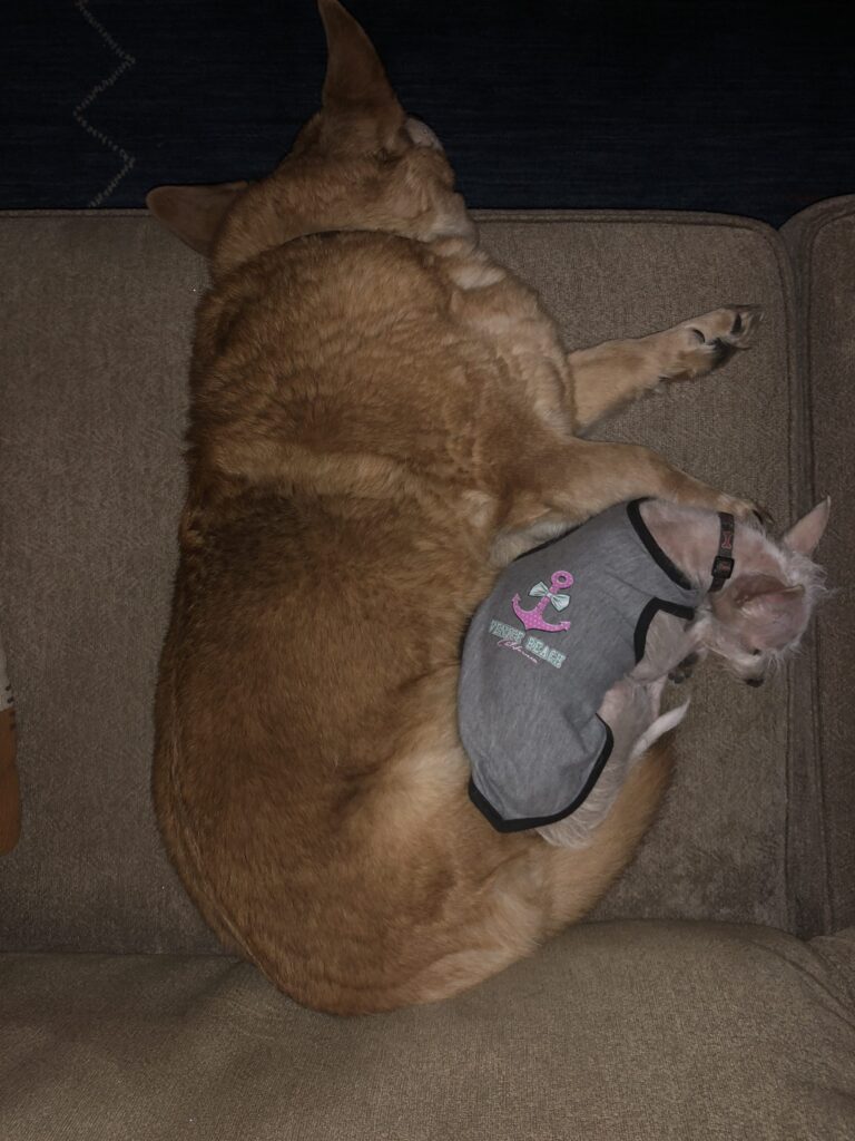 I clenched the tags in my fist to quiet them, put them down so they wouldn’t make that sound again, and scooped her up, holding her as tight as I could without breaking bones, her ears righteously kissed, cooing how much I loved her. She was warm; she let me sway her. I put her back onto the couch cushion where immediately she sniffed her butt.